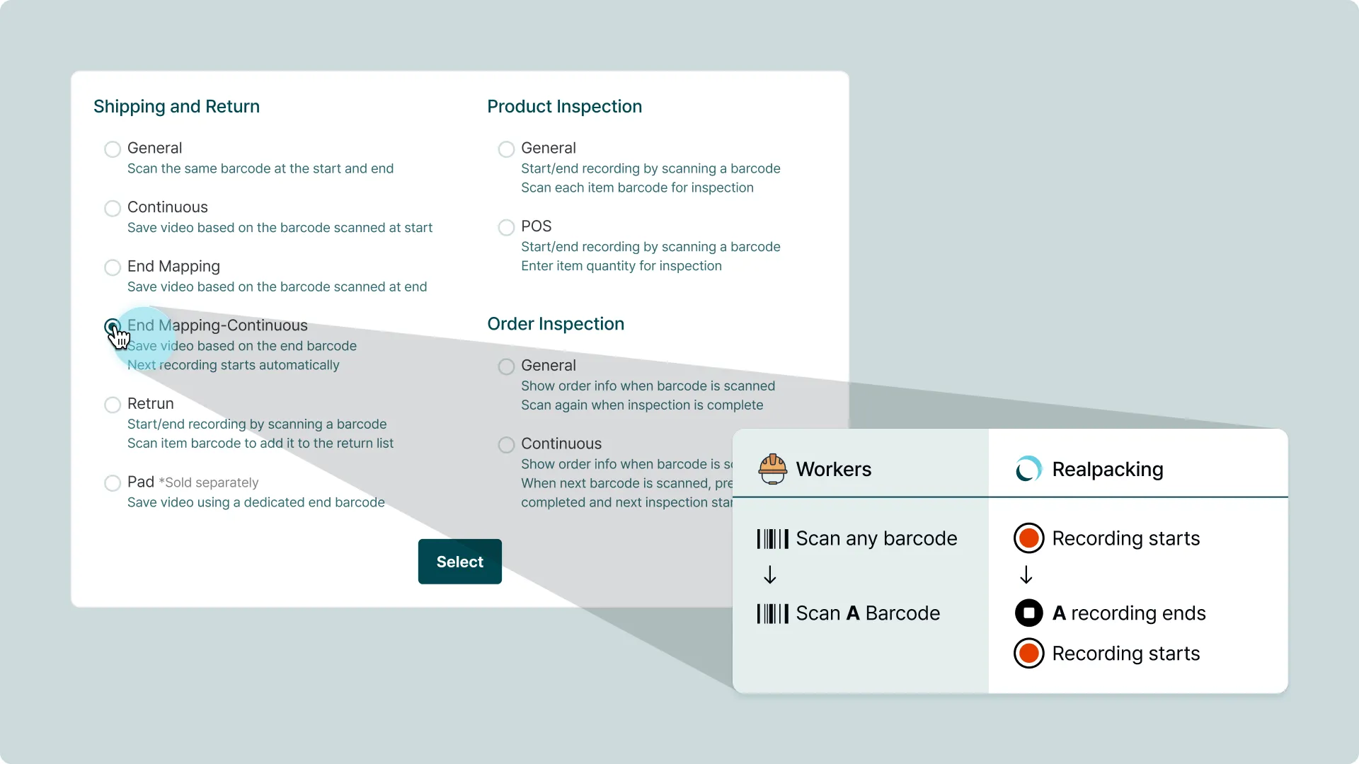This mode is ideal for line-based workflows where multiple workers handle different tasks and assigning a recording code to each step isn't practical. For single-worker operations handling picking, packing, and sealing from start to finish, the existing Standard, End-Mapping, or Continuous modes work perfectly.