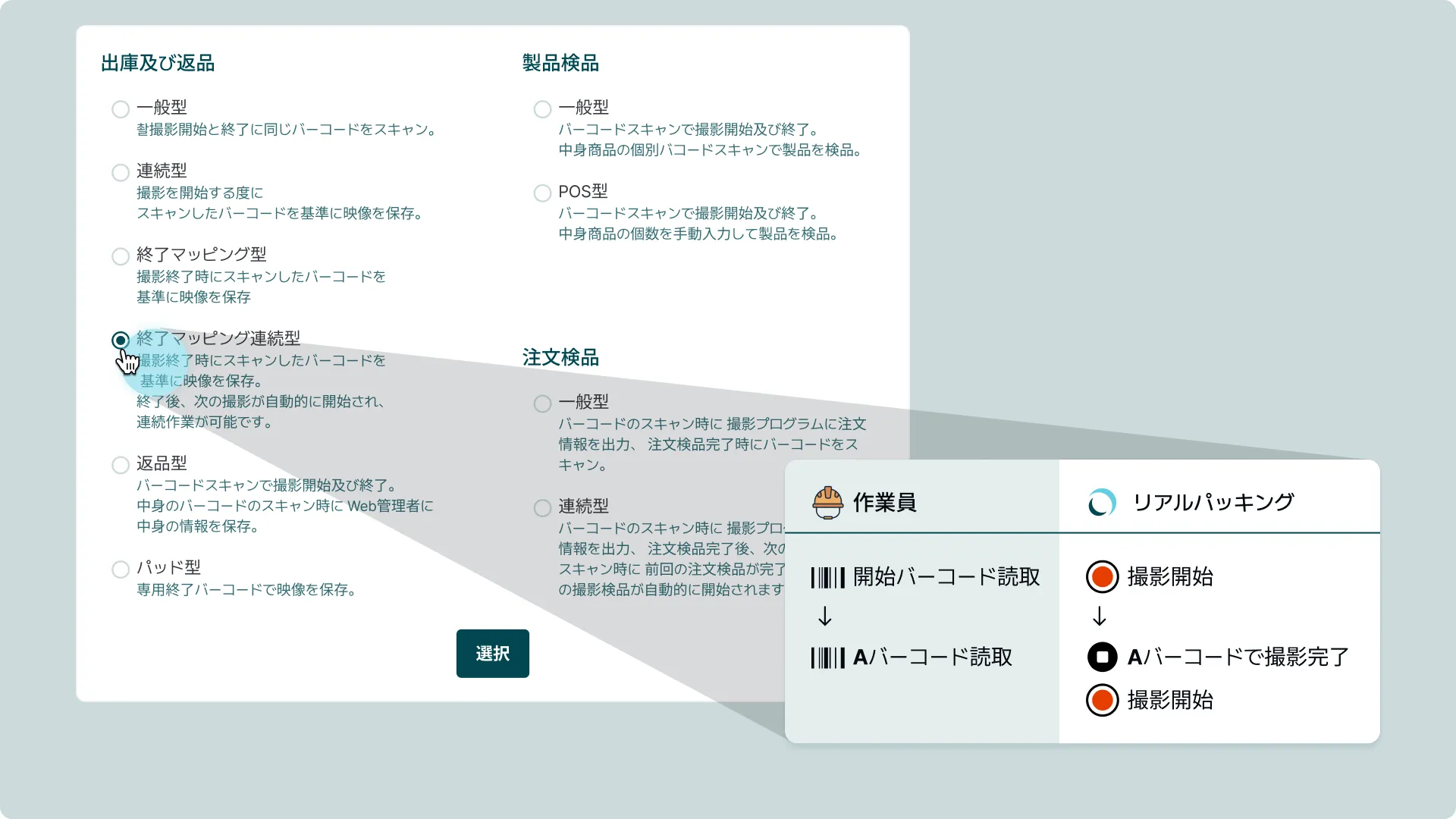 一人の作業者がピッキングから梱包、封函まで一貫して行う場合は、従来の一般型、終了マッピング型、連続型をご利用ください。複数名で分業するライン作業のように、各工程ごとに撮影コードを付与しにくい環境では、終了マッピング連続型が適しています。