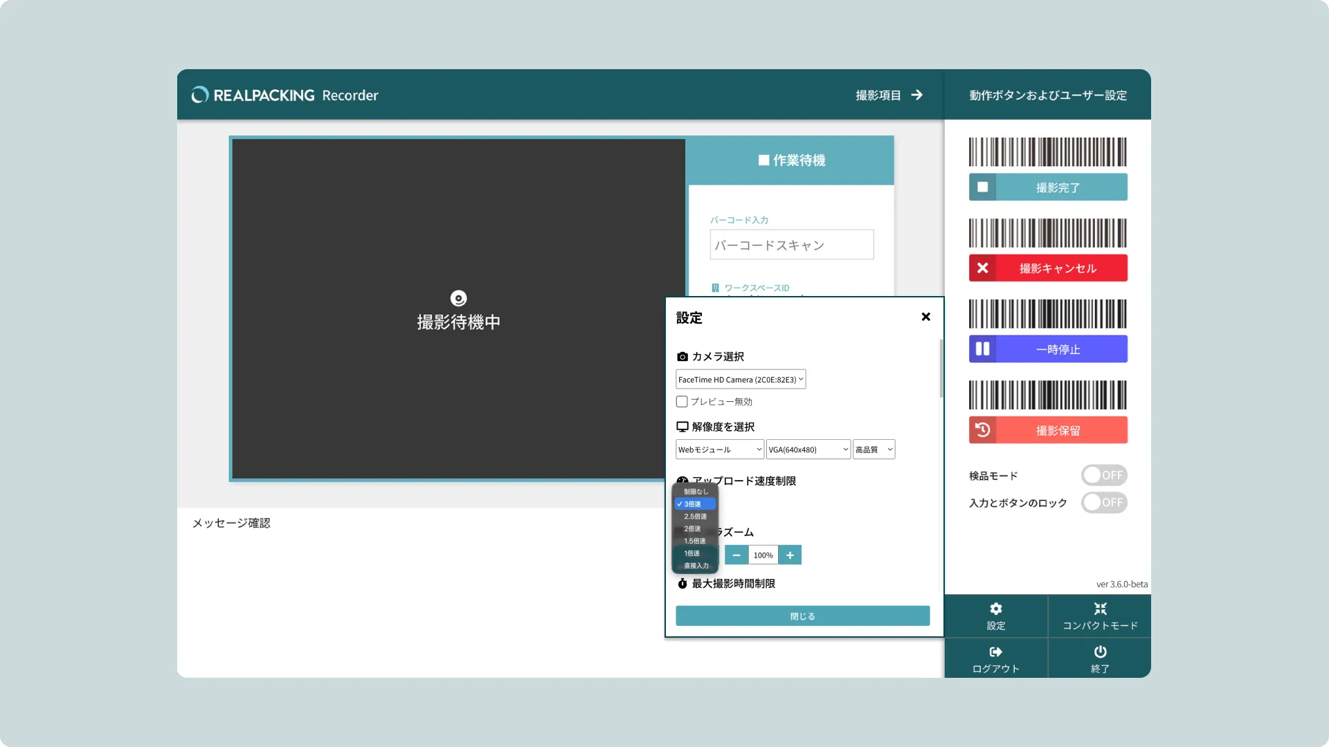 インターネット速度が遅い現場のために、リアルパッキングの映像アップロード速度制限機能が追加されました。WMSや送り状出力システムなど、複数のプログラムを同時に使用する環境でも安定した運用ができるよう、ネットワーク帯域幅を調整できます。