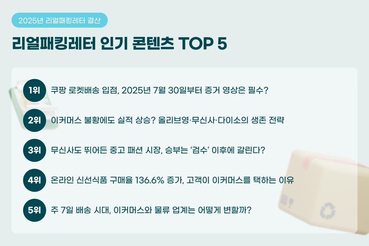 올해 리얼패킹레터는 총 129건의 콘텐츠를 통해 이커머스와 유통, 물류 운영 환경의 변화를 꾸준히 기록해왔습니다. 정책 변화부터 플랫폼 전략, 검수와 신뢰, 배송 경험의 변화까지 현장에서 실제로 체감되는 이야기들을 중심으로 전해왔습니다.