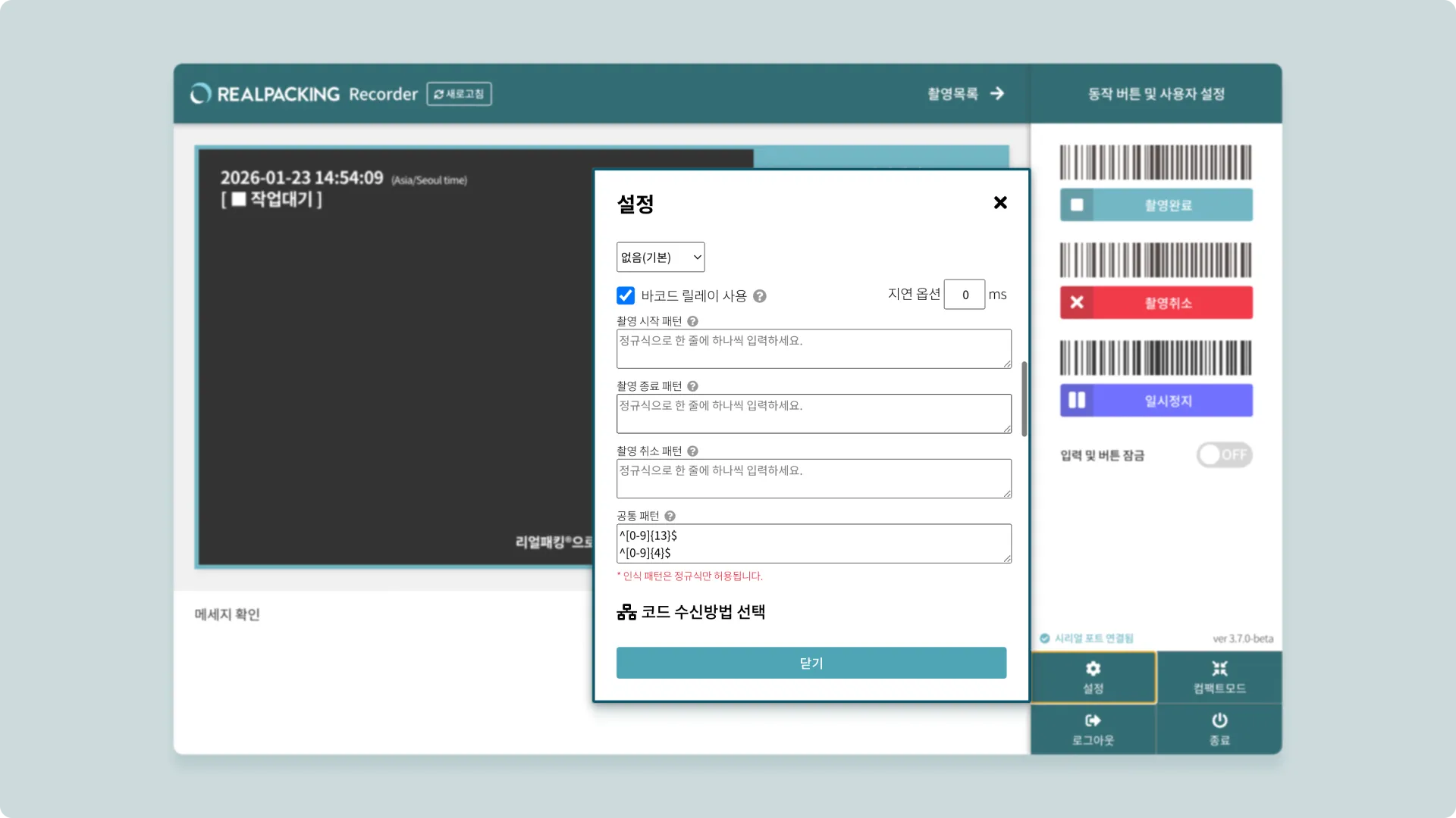 이번 업데이트에서 추가된 바코드 릴레이 고급 옵션은 이런 다양한 현장 상황에 맞춰 시작 조건과 종료 조건을 각각 세밀하게 설정할 수 있습니다. 정규식을 활용해 시작 바코드와 종료 바코드를 별도로 지정할 수 있어, 현장의 바코드 체계가 어떻게 구성되어 있든 기존 프로세스 그대로 리얼패킹을 활용할 수 있습니다.