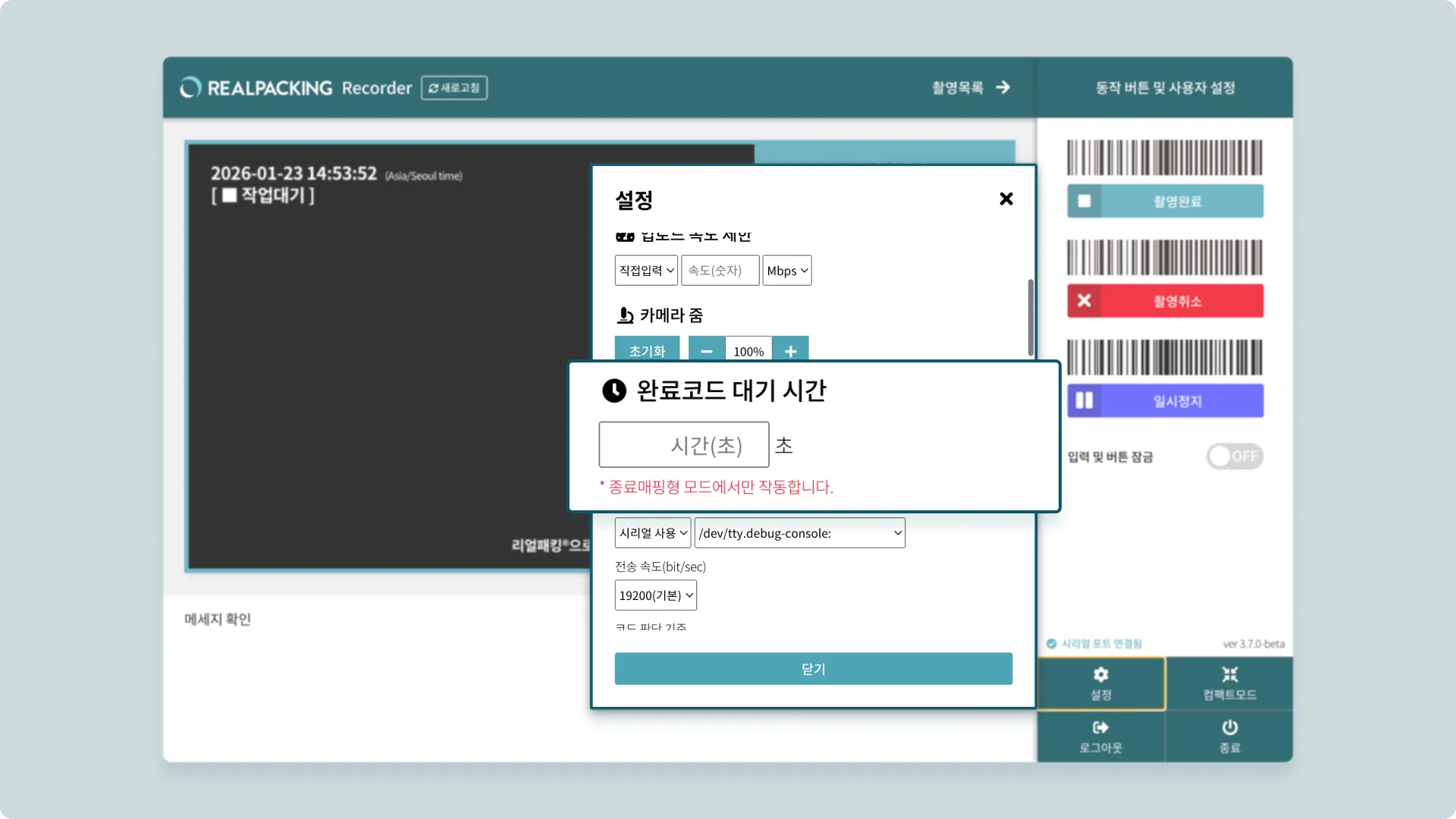 예를 들어, 대기 시간을 60초로 설정하면 촬영 시작 후 60초 안에 완료 코드가 스캔되지 않으면 해당 건은 자동 취소되고, 다음 촬영 대기 상태로 전환됩니다.