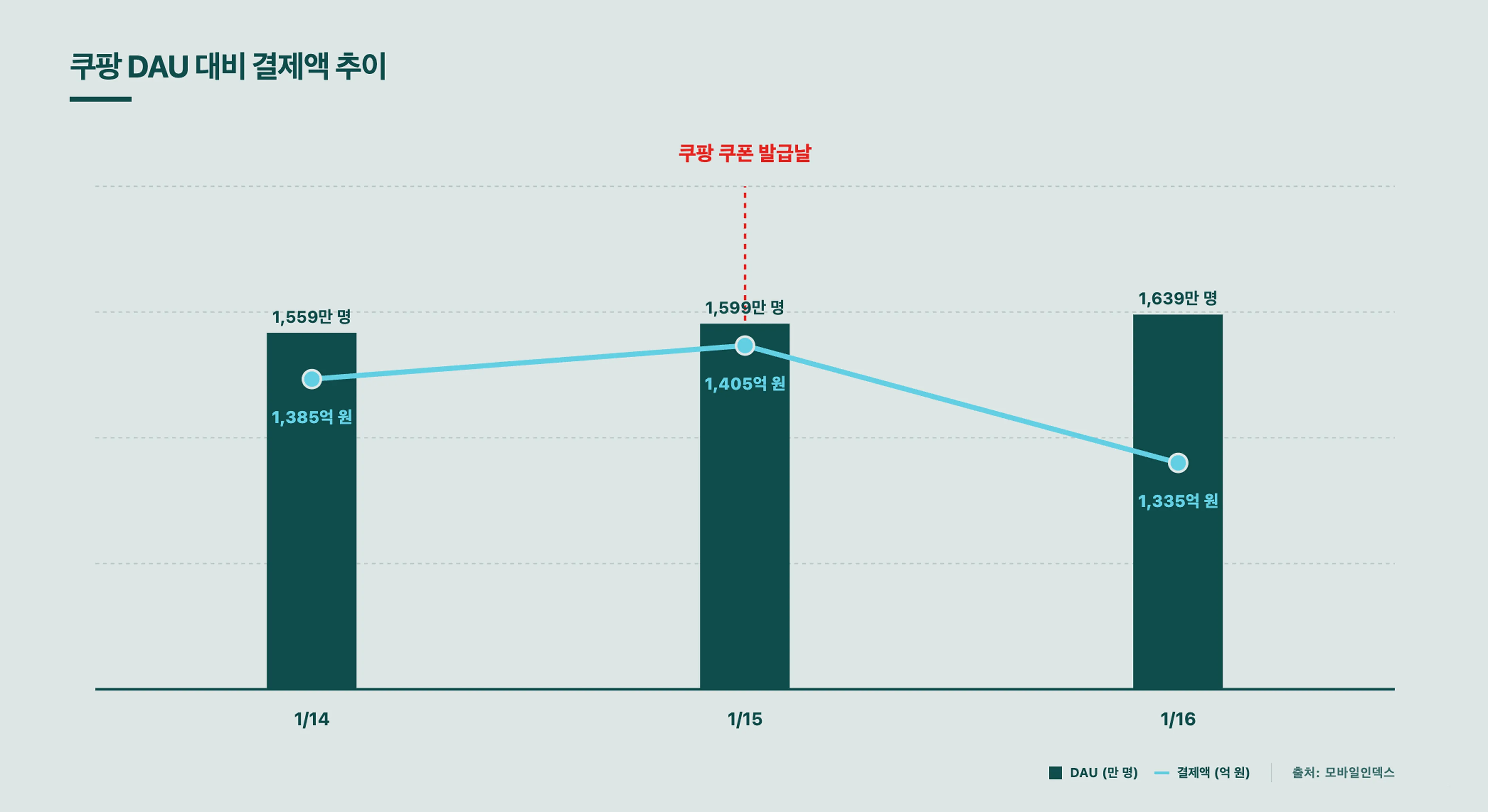하지만 결제액은 반대 방향으로 움직였습니다. 쿠폰 지급 당일 결제액은 1,405억원으로 전날보다 20억원 줄었습니다. 다음 날은 70억원, 그 다음 날은 130억원이 더 빠졌습니다. 3일간 누적 감소액은 약 220억원에 달합니다.