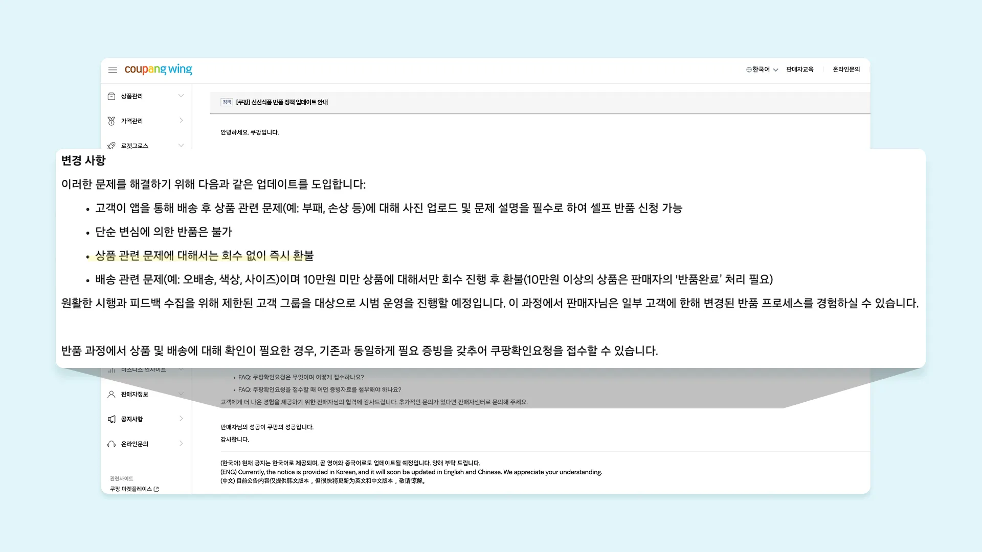 요약하자면, 이번 쿠팡의 반품 정책 업데이트는 고객의 반품∙환불 경험을 개선하는 방향으로 설계되었습니다. 회수 없는 환불이 확대되면, 판매자는 ‘출고 당시 문제가 없었음’을 보여줄 수 있는 운영 체계를 갖추는 것이 더욱 중요해집니다.