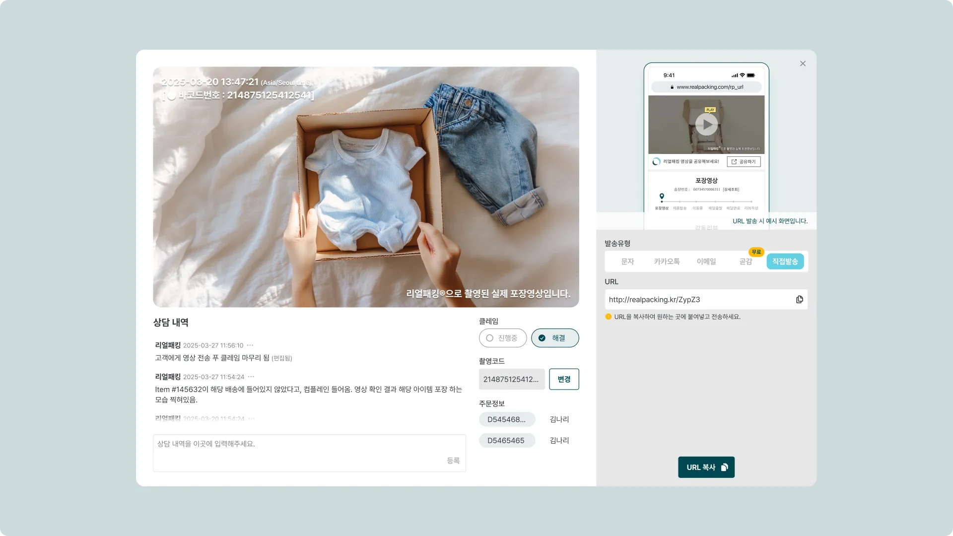 ✔ 모든 영상은 웹관리자에서 확인하고 고객에게 전송 가능하며, 전송 시 리얼패킹 도메인을 달고 발송되어 확인 시 리얼패킹이 제공하는 뷰페이지에서만 확인 가능합니다. 그러므로, 브랜드도 고객도 편집할 수 없습니다.